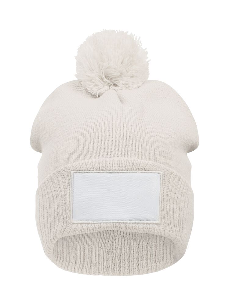 Berretto lavorato a maglia con risvolto. Pon pon bicolore. Patch stampabile in twill di cotone.