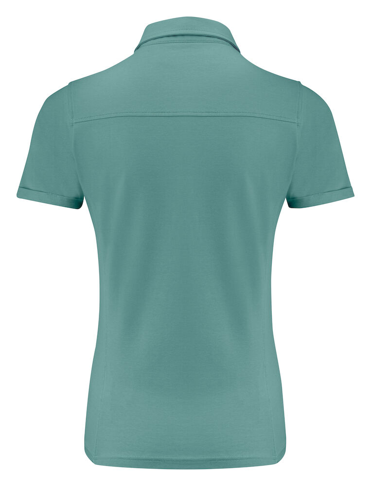 Polo elasticizzata in single jersey donna. Colletto button-down nascosto. Bottoni tono su tono. Manica risvoltata. Vestibilità aderente Modern. Packaging ecologico compostabile.