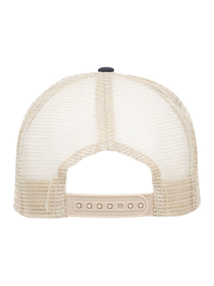 Cappellino trucker a 5 pannelli. Twill di cotone spazzolato e mesh posteriore in poliestere. Patch stampabile in twill di cotone. Chiusura snapback. Patch, rete e cuciture beige.